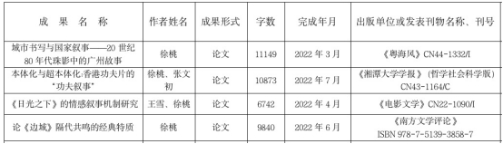发表的4篇学术论文均发表在国内期刊,中国知网可查询,其中有两篇发表在国内核心期刊《湘潭大学学报》(哲学社会科学版)、《电影文学》。从相关领域的研究现状而言,《城市书写与国家叙事——20世纪80年代珠影中的广州故事》一文的审稿编辑认为该论文将20世纪80年代广东改革开放风起云涌之时,反映在文化电影界,就是在深度切入社会生活的同时,也在文艺形式、内容等方面进行了许多大胆而有益的探索,该论文将这两方面很好地融合到一起,较深刻地诠释了主题;《本体化与超本体化:香港功夫片的“功夫叙事”》则就香港功夫电影中的岭南文化重构的影视话语方式进行了分析,对粤港澳三地的文化基础进行了厘清,以及在现代化的媒介环境下是如何重组并进行地域文化融汇的,开拓了研究视野;《<日光之下>的情感叙事机制研究》就最新上映的关于地域电影建构方式进行了研究;《论<边城>隔代共鸣的经典特质》探讨了经典文本的形成过程,以及与时代历史的关系。