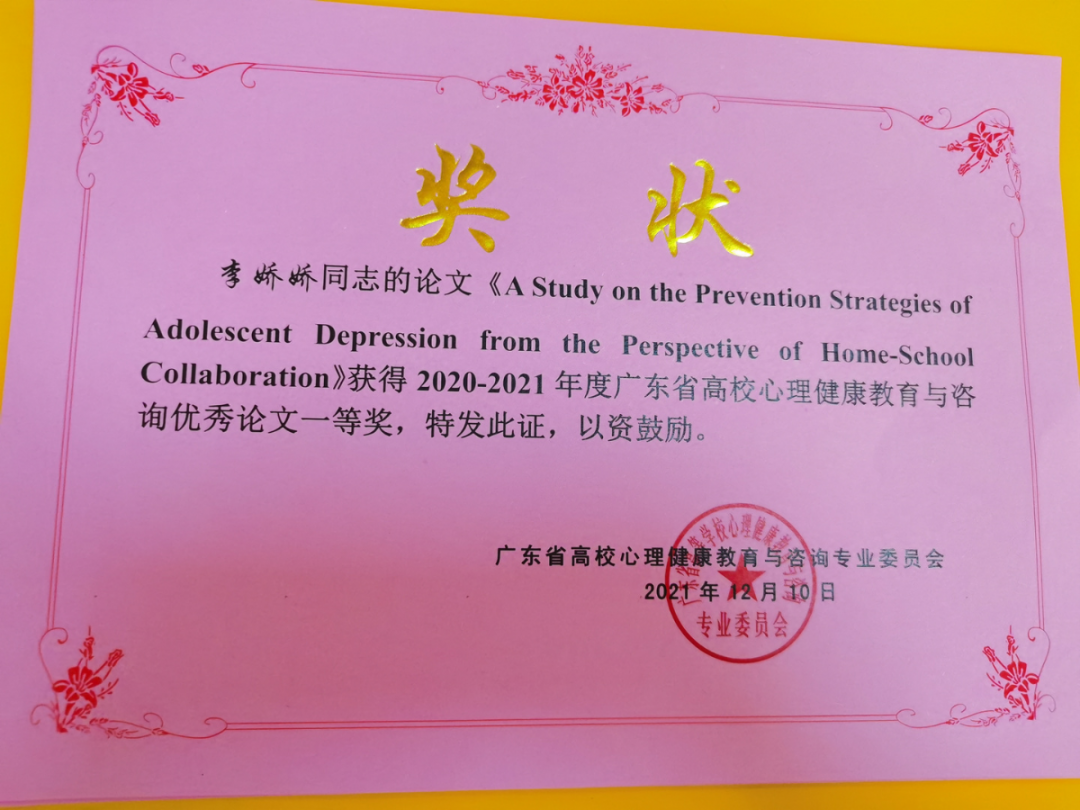 5李娇娇获得2020-2021年度广东省高校心理健康教育与咨询优秀论文一等奖;侯小花、王洁获得优秀论文二等奖;何顺发获得优秀论文三等奖称号