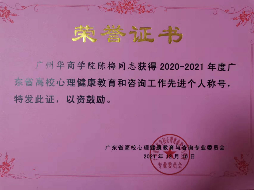 4陈梅获得2020-2021年度广东省高校心理健康教育与咨询工作先进个人称号