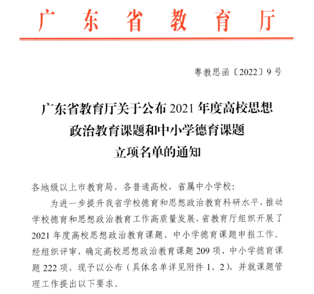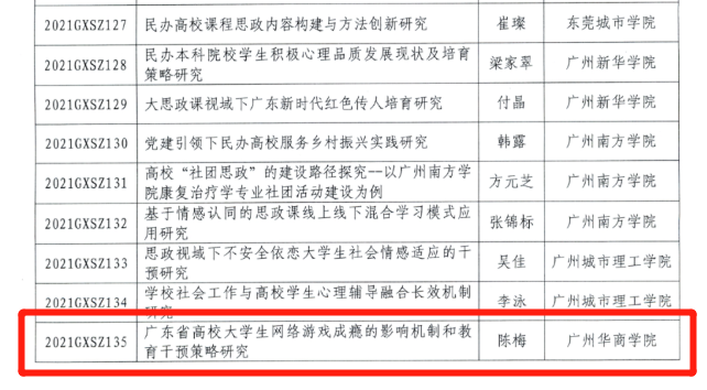 同时,广东省教育厅也公布2021年度高校思想政治教育课题和中小学德育课题立项名单,威廉希尔williamhill中文学生处陈梅老师申报的《广东省高校大学生网络游戏成瘾的影响机制和教育干预策略研究》(项目编号:2021GXSZ135)项目获批立项。