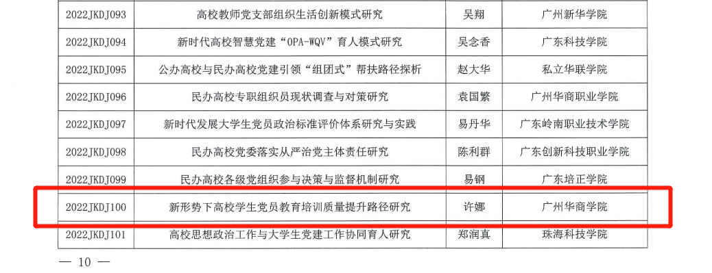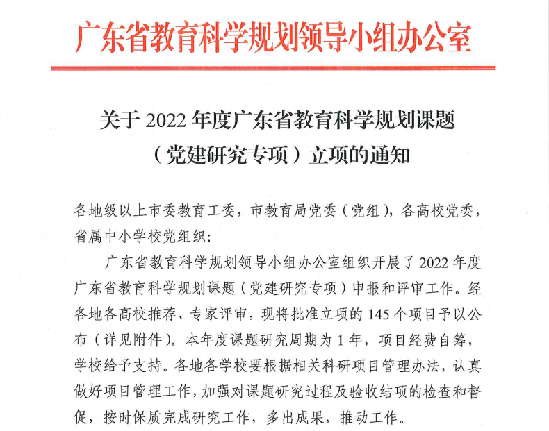 2022年5月12日,广东省教育科学规划领导小组办公室公布了2022年度省教育科学规划课题(党建研究专项)立项名单,威廉希尔williamhill中文学生处许娜处长申报的《新形势下高校学生党员教育培训质量提升路径研究》(项目编号:2022JKDJ100)项目获批立项。