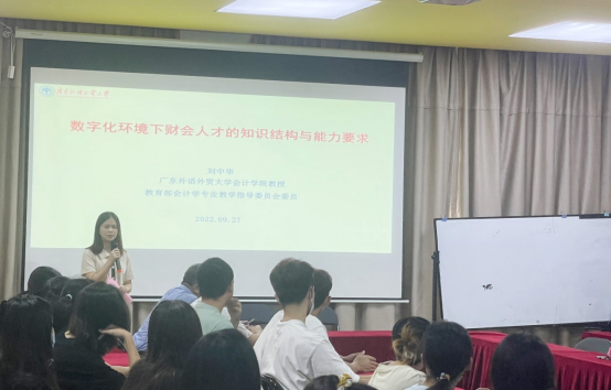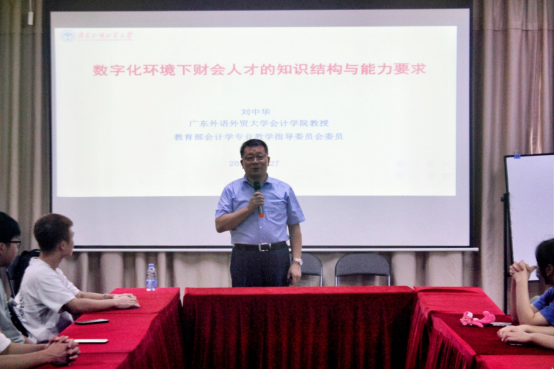 2022年9月27日下午3:00,教育部会计学专业教学指导委员会委员,原广东外语外贸大学会计学院院长刘中华教授应邀在会计学院报告厅给2021级会计学专业会计智能化方向班学生作了题为《数字化环境下财会人才的知识结构与能力要求》的讲座。
