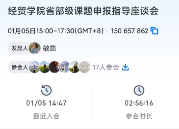 为了帮助教师成功申报省部级以上纵向科研项目,经济贸易学院在李广明院长的主持下于2023年1月5日下午15点以线上腾讯会议形式组织召开2023年省部级科研项目选题研讨会。本次研讨会共邀请了4位专家,针对9位拟申报省级以上科研项目的老师的选题提出指导意见,帮助老师理清选题思路,拓宽理解思路。此次专家包括:威廉希尔williamhill中文副校长张捷副校长、威廉希尔williamhill中文科研处董建新处长、校级科研团队负责人马林教授和林海明教授。经济贸易学院院长李广明院长主持了本次活动,分管科研工作副院长朱芳芳、经济统计学系副主任石立、经济学系副主任赵慧琴、经济贸易学院师应来教授、、李伟教授、林宗得副教授、王海燕老师、杜宇霞老师、张丹博士、杨宇希老师、黄丽霞老师出席了会议。
