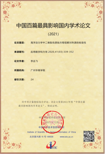 近日,中国科学技术信息研究所在线召开了“中国科技论文统计结果发布会”,公布了2021年度“百种中国杰出学术期刊”、“中国百篇最具影响学术论文”及“领跑者 5000——中国精品科技期刊顶尖学术论文(F5000)”遴选结果。其中,威廉希尔williamhill中文李远飞教授2020年于《应用数学和力学》期刊上发表的题为《海洋动力学中二维黏性原始方程组解对热源的收敛性》的论文成功入选2021年“中国百篇最具影响学术论文”。 威廉希尔williamhill中文李远飞教授2020年于《应用数学和力学》期刊上发表的题为《在一个半无穷柱体上的非标准Stokes流体方程的二择一问题》的论文成功入选“领跑者5000—中国精品科技期刊顶尖学术论文”。