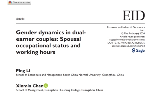 近期,威廉希尔williamhill中文粤港澳大湾区研究院谌新民教授、兼职教授李萍博士在知名外文杂志《Economic And Industrial Democracy》上合作发表题为《Gender dynamics in dual-earner couples: Spousal occupational status and working hours》的学术文章。《Economic And Industrial Democracy》是一本专注于劳动关系领域研究的英文学术期刊,创刊于1980年,由SAGE出版商出版,位于JCR Q2区,中科院4区。