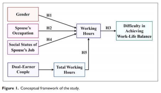根据该研究提出的理论框架(图一)可以看出家庭中配偶职业对另一方的工作时长有直接和间接的影响。该研究通过对2011-2017年中国综合社会调查的数据研究发现,随着家庭中男女任何一方职位等级的上升,男女双方工作时长都会减少。