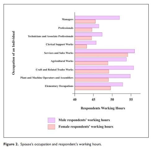 该研究将职业分为管理、“白领”、“蓝领”三类,由图二可知,家庭中从事管理类工作的丈夫,其妻子工作时长相对较短。而从事“白领”类、“蓝领”类工作的丈夫,其妻子的工作时长相对较长。然而,不同性别呈现出差异,即职位等级较高的丈夫往往较少做家务,从而增加了妻子的负担。