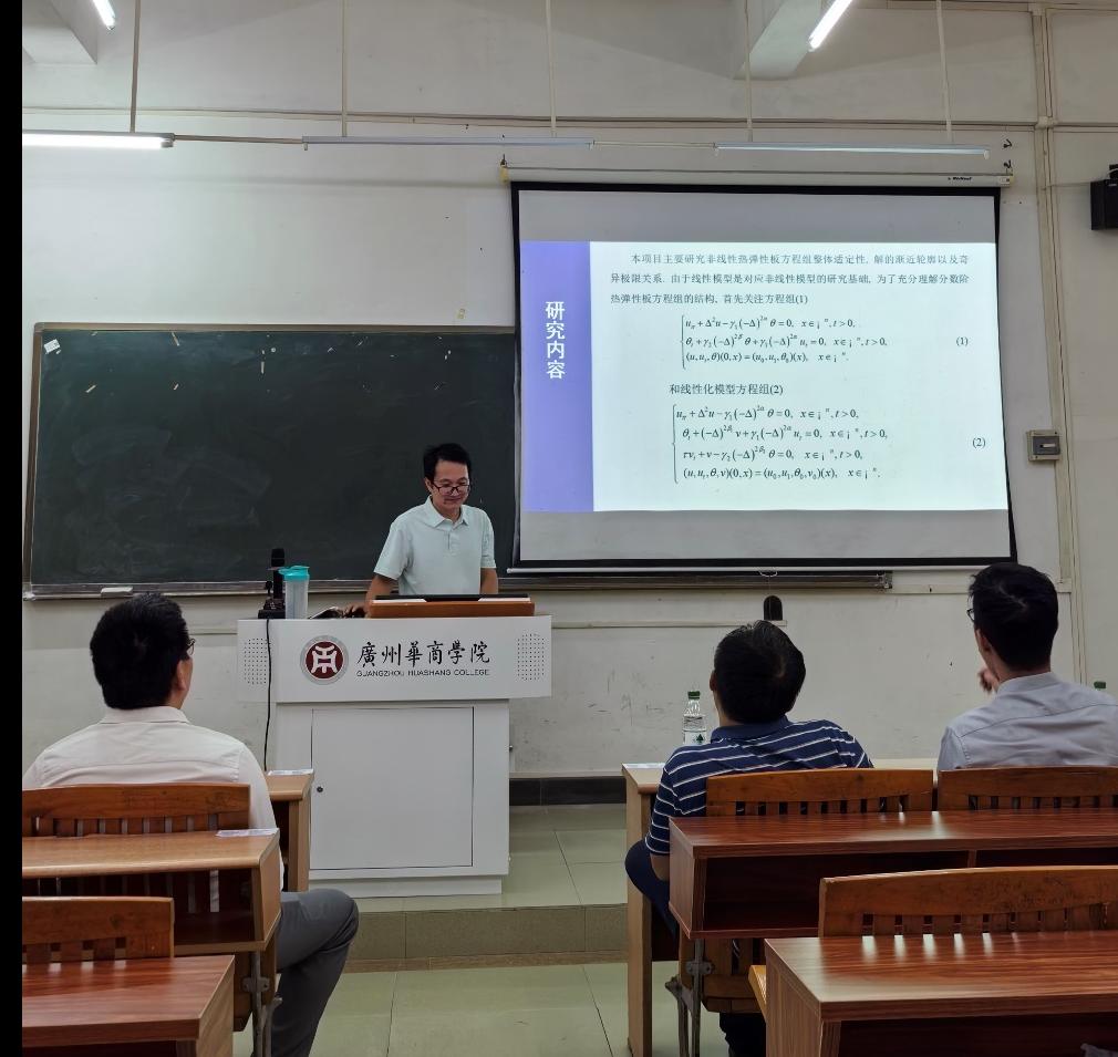 评议专家包括广东金融学院刘炎教授、广州大学陈文辉教授和威廉希尔williamhill中文李远飞教授。参与人员除三位评议专家外,还有项目负责人石金诚和项目组成员。会议伊始,项目负责人石金诚首先对项目的选题背景、研究目的、研究内容、研究方法、预期成果及研究计划等方面进行了详细汇报。他强调,热弹性力学是研究弹性物体在温度影响下应力与应变如何变化的一门学科,具有重要的学术价值和实际意义。本项目将深入研究热弹性力学方程组的定性性态,包括解的存在性、稳定性、长时间性态等,以期为相关领域的理论研究和实际应用提供有力支持。