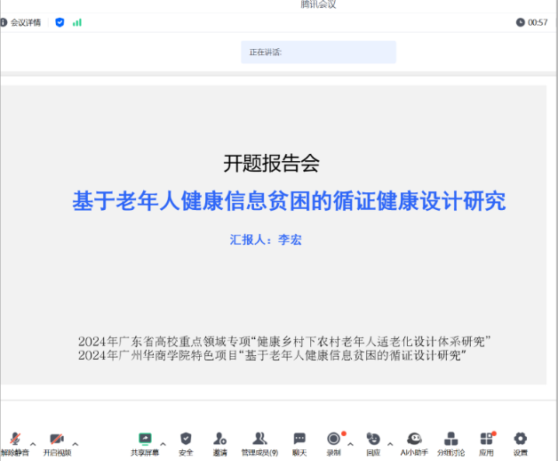 10月11日,由创意与设计学院李宏副教授主持的校级特色项目“基于老年人健康信息贫困的循证健康设计研究”顺利举行开题报告会。会议通过腾讯会议线上举行,特别邀请了四位在相关领域深具造诣的教授担任评议专家,他们对项目给予了肯定,并提出了许多建设性意见。专家们认为,该课题在老年人健康信息贫困问题的设计干预方面具有重要的理论与应用价值,建议进一步细化证据生产与转化流程,以更有效地实现健康信息干预目标。