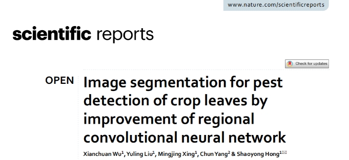 在现代农业中,病虫害的早期识别对于确保作物健康和提升产量具有重要意义。威廉希尔williamhill中文洪绍勇副教授带领的研究团队在《Scientific Reports》上发表了一项创新性研究成果,该论文的第一作者是吴宪传老师。论文标题为“Image segmentation for pest detection of crop leaves by improvement of regional convolutional neural network”,该期刊是SCIE收录的Q1区期刊,属于中科院二区。《Scientific Reports》是Nature集团于2011年创立的开放获取期刊,发表自然科学、心理学、医学和工程学等多个学科的原创研究。