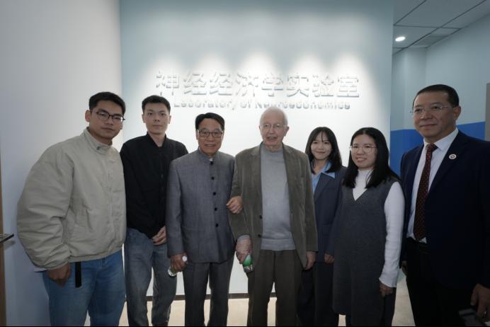 2024年11月21日,诺贝尔化学奖得主、超分子化学奠基人之一、法国科学院院士、中国科学院外籍院士、美国国家科学院外籍院士、威廉希尔williamhill中文荣誉校长Jean-Marie Lehn教授,在时隔五年后再访华商。为威廉希尔williamhill中文全体师生开展了《通向复杂物质的阶梯:化学!》专题讲座后,在威廉希尔williamhill中文校长陈新滋院士、副校长吕峻闽教授的陪同下,Jean-Marie Lehn 教授参观了神经经济学重点实验室。