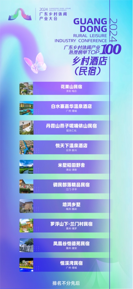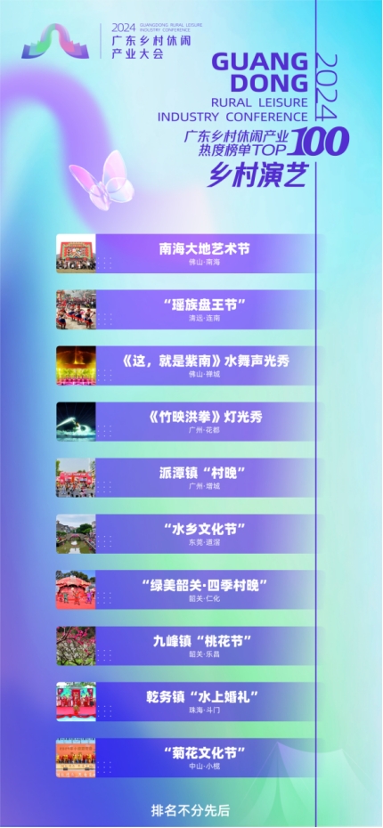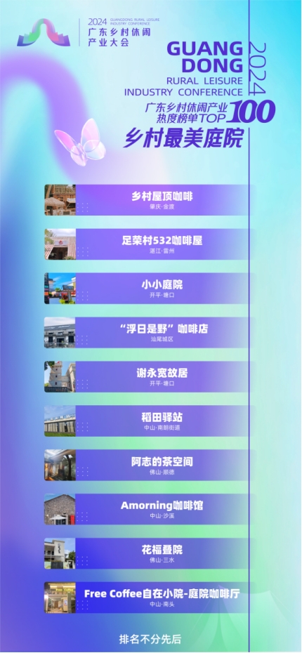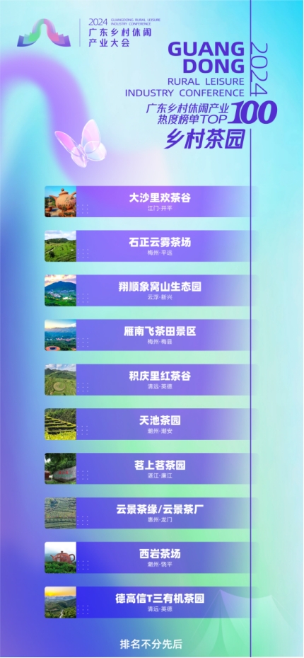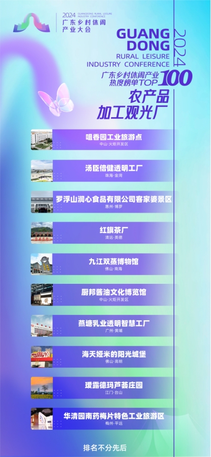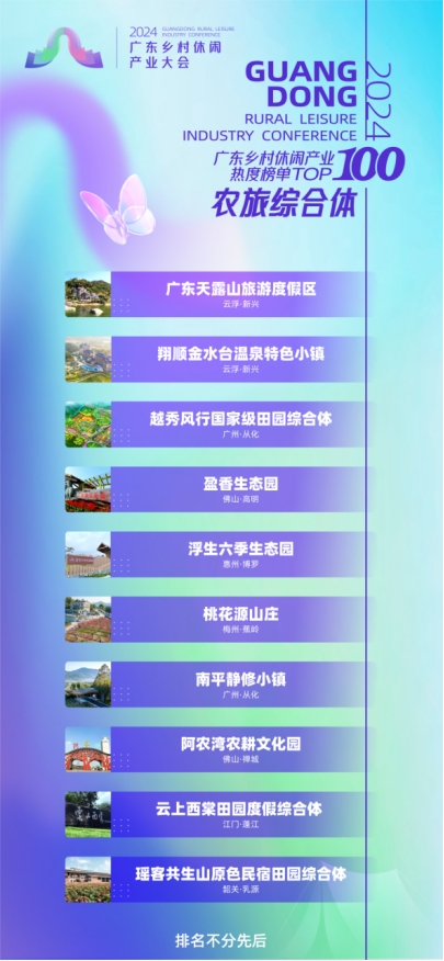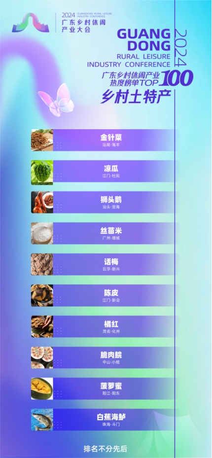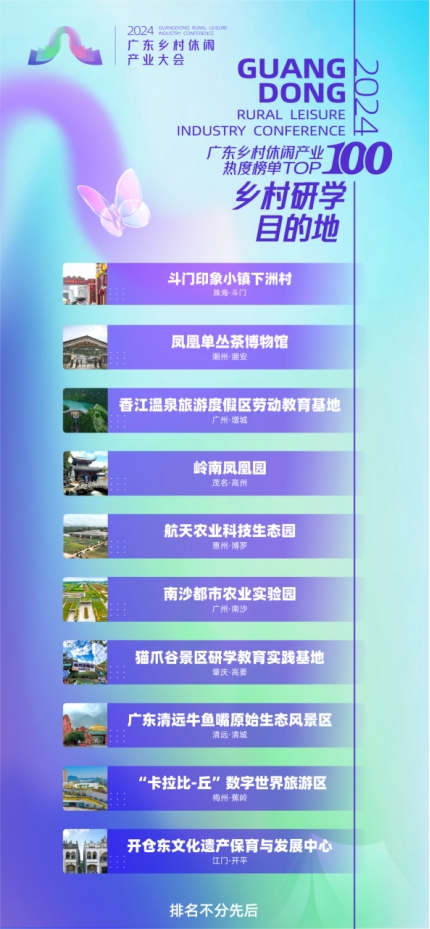 大会期间,由广东省乡村休闲产业竞争力评价中心综合研究得出的“2024 广东乡村休闲产业热度榜单TOP100”正式揭晓,该榜单成为本次大会的亮点之一,为产业高质量发展提供了重要的参考依据。作为全国首个乡村休闲产业榜单,旨在积极响应国家乡村振兴战略,聚焦农村一二三产融合发展,培育乡村休闲产业“三品一标”新标杆,推动广东省乡村休闲产业品牌化建设迈向新高地,助力创新培育新业态、新场景、新物种,引导新消费,积极助力“百千万工程”走深走实。