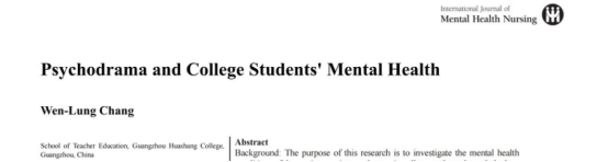 2024年,教师教育学院张纹珑老师以第一作者身份在《International Journal of Mental Health Nursing》期刊发表了题为“Psychodrama and College Students' Mental Health”的论文。该期刊是SCI、SSCI双检索期刊,是JCR Q1分区,中科院二区。《International Journal of Mental Health Nursing》创刊于2002年,发表探讨心理健康实践和研究的当前趋势发展、教育和培训方向、专业问题、管理方法、政策制定、道德问题、理论探究和临床问题。
