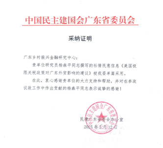 近日,中心研究员杨森平教授撰写的社情民意信息《美国极限关税政策对广东外贸影响的建议》被中国民主建国会广东省委员会单篇采用。