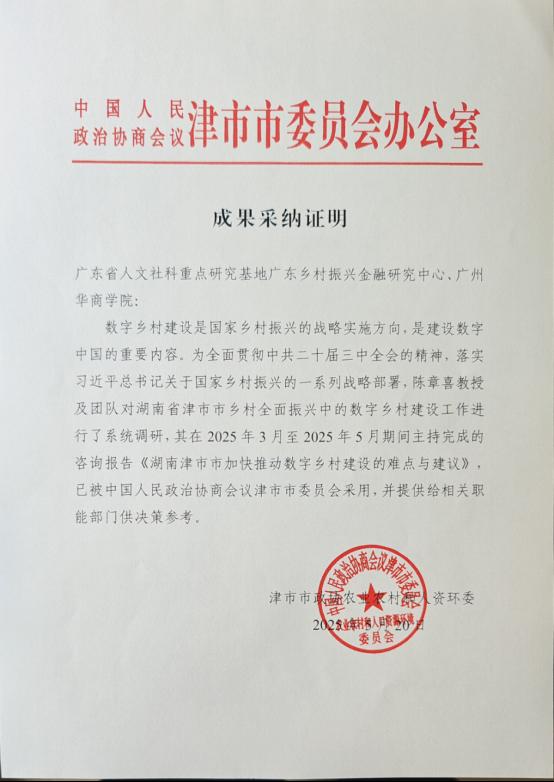 为全面贯彻落实中共广东省委、广东省人民政府关于“百县千镇万村高质量发展工程”的决策部署,充分借鉴国内相关地区乡村振兴的经验,陈章喜教授率队于2025年3月底至4月初对湖南省津市市数字乡村建设工作进行了深入细致调研,在此基础上形成了《湖南津市市加快推动数字乡村建设的难点与建议》的调研报告。该调研成果于2025年5月20日获中国人民政治协商会议津市市委员会采纳,并提供给该市政府相关职能部门决策参考。
