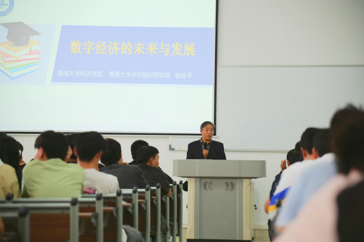 讲座前,同学们以热烈的掌声欢迎杨教授的到来。讲座伊始,杨教授用通俗易懂的话语向同学们介绍了数字经济的概念特征,并指出以数字信息作为关键生产要素的数字经济将持续推动经济社会数字化转型、助推经济社会发展变革、加速重构经济发展与治理模式,已经成为学术界和各国政要的共识。同时他也指出我国数字经济在快速发展的同时也面临着一些问题:传统产业数字化转型缓慢、各国日益重视隐私信息的保护、产业发展不均衡、互联网平台的违规操作等方面带来的挑战。基于此,未来数字经济将朝“数字产业化、产业数字化”的方向发展,在促进消费数字化、投资数字化、贸易数字化以及服务的可贸易性,转变企业资产结构,提高政府治理效能,改变城市治理方式等方面赋能经济社会高质量发展。